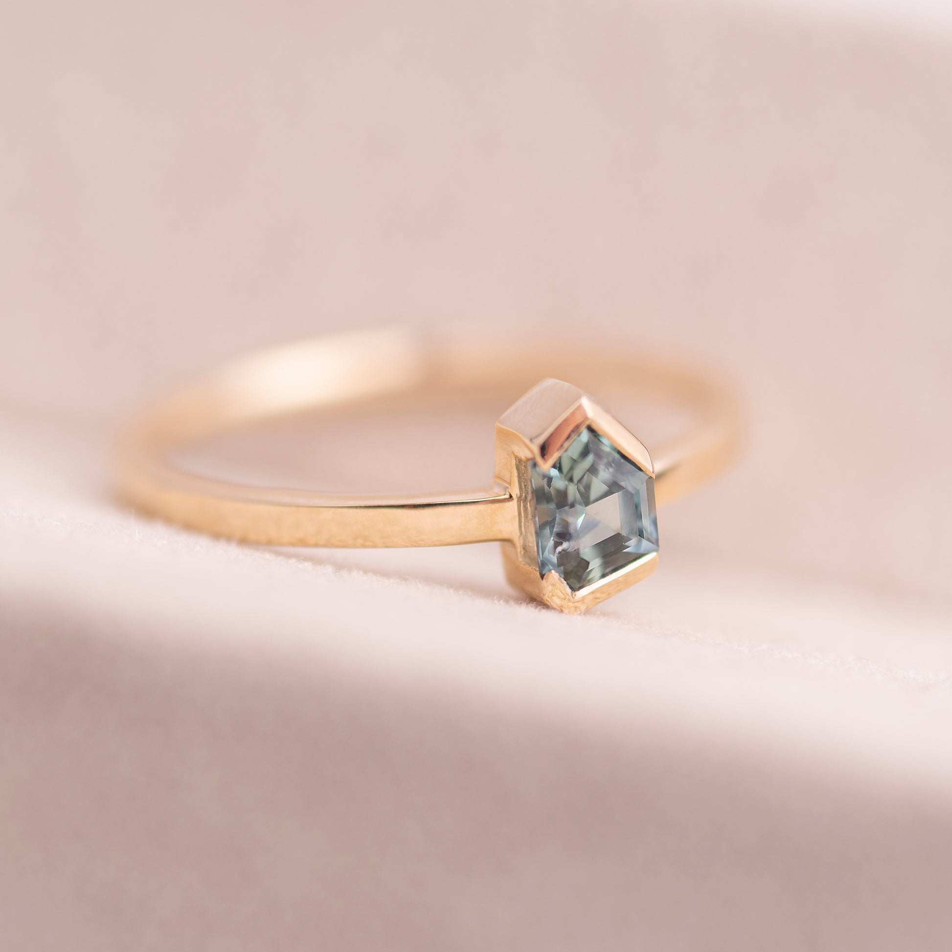 The Adele ring is a captivating piece, crafted in yellow gold and featuring a fantasy-cut Montana sapphire. Its unique cut and rich blue-green tones create a striking and elegant design that stands out with sophistication and charm.