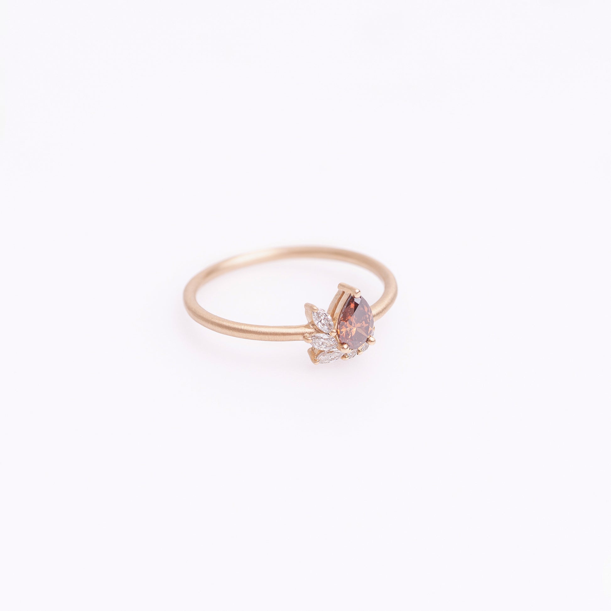 At the center glows a large pear-shaped brown diamond, chosen for its warm, earthy hue and remarkable brilliance. Its rich color is beautifully complemented by six accompanying diamonds: three round white diamonds and three marquise-cut white diamonds. This delicate arrangement enhances the central stone’s character, adding layers of sparkle and subtle contrast that catch the light from every angle.