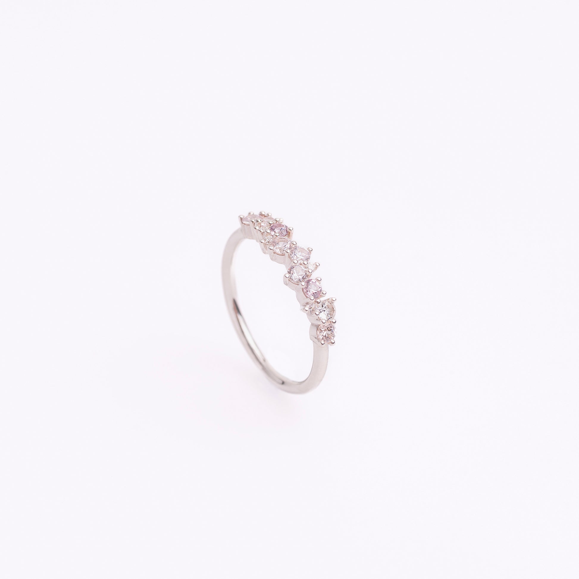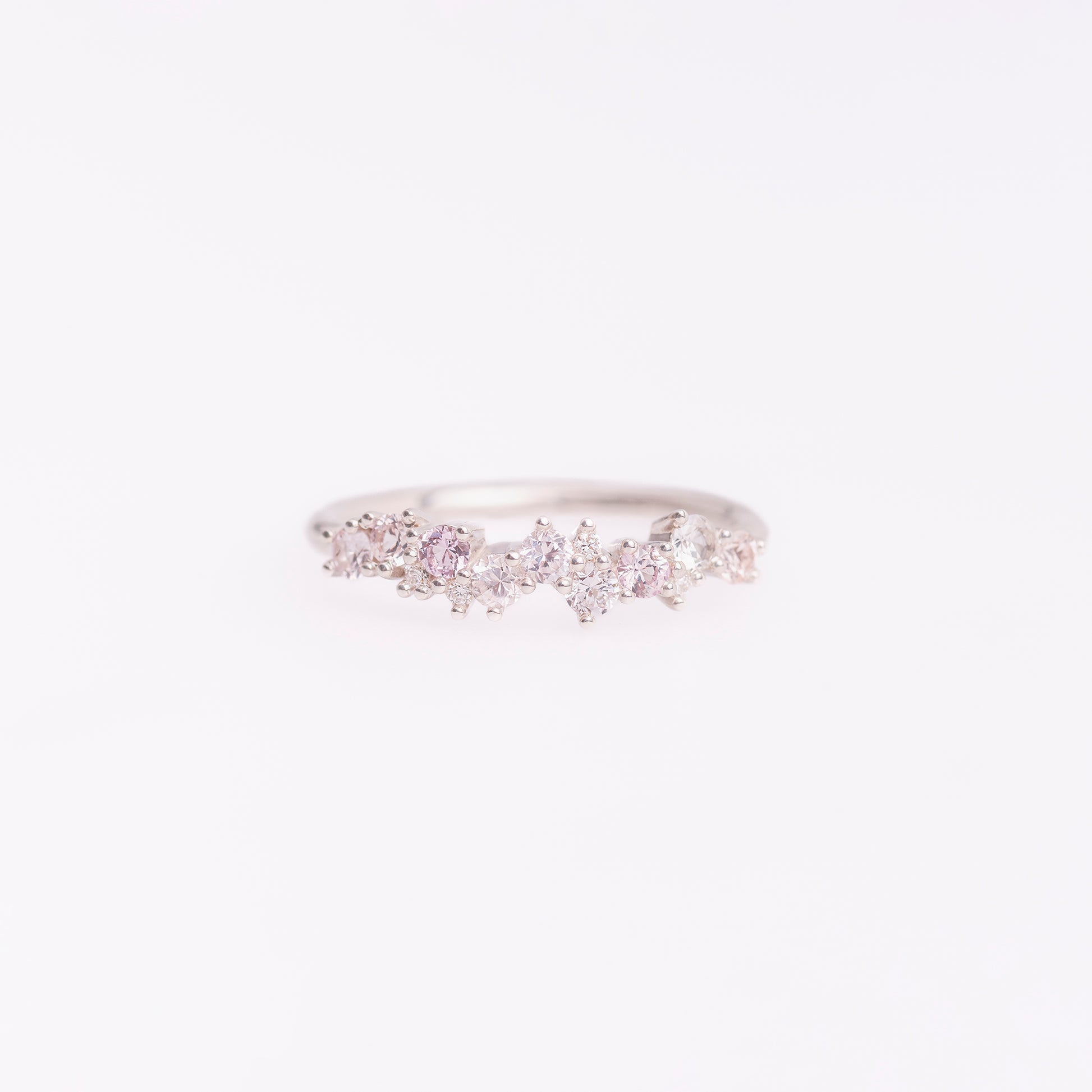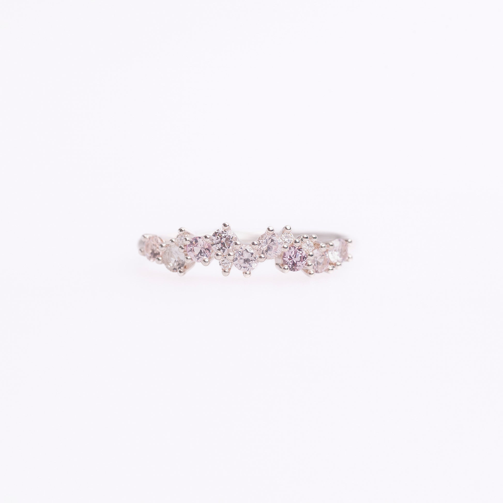The ring is adorned with dazzling sapphires in vibrant shades of soft pink and white diamonds, creating a beautiful contrast that adds a playful yet refined touch. Each gemstone is carefully selected, ensuring a unique and eye-catching design.
