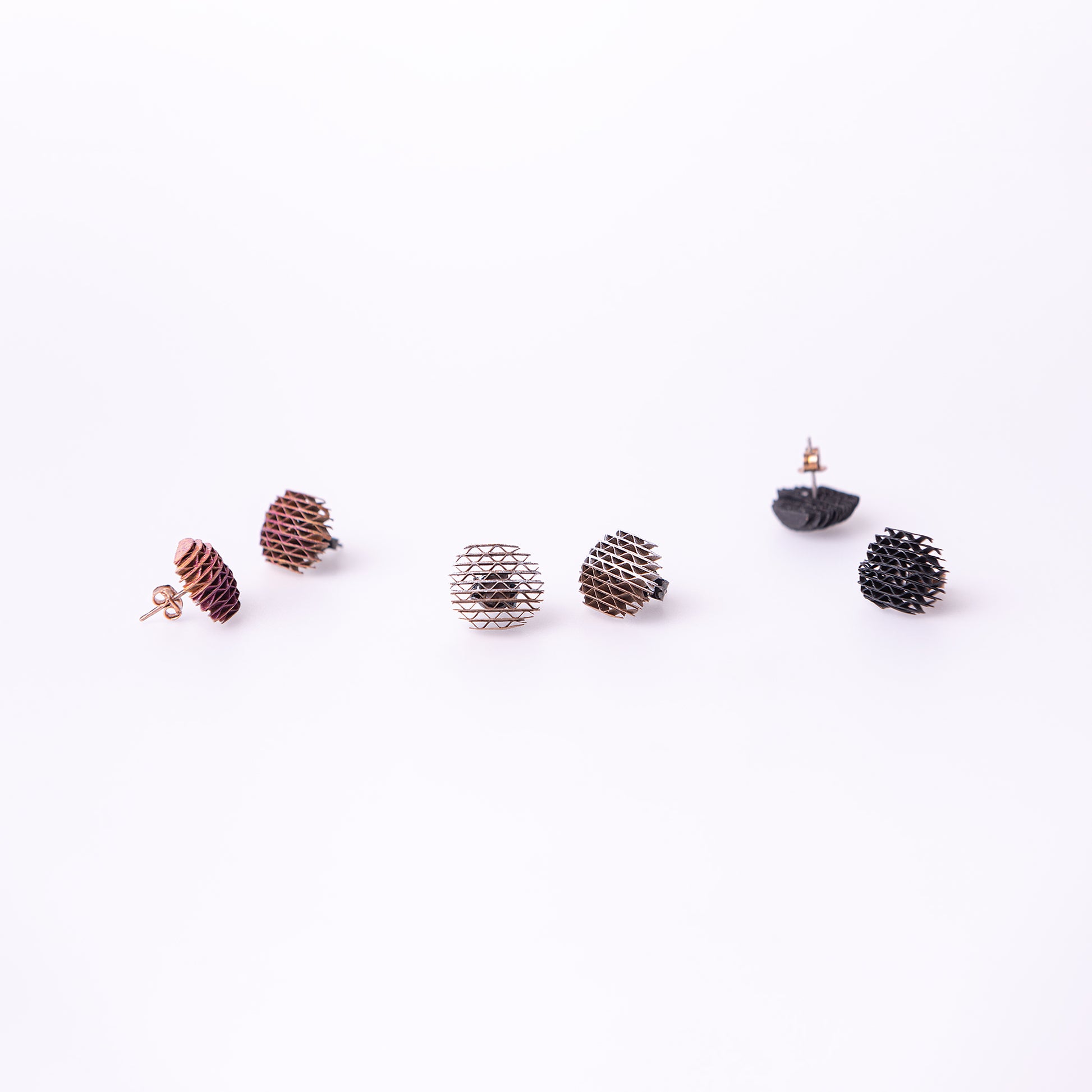 Veron’s concept for the Relamella Earrings was to present an aluminum lens in a mysterious and innovative way, achieved through the use of lamellar structures. The unique Moiré pattern reveals itself in each piece, adding depth and intrigue to the design. Crafted from recycled cardboard and sterling silver, these earrings combine eco-conscious materials with cutting-edge design, creating a striking and sustainable statement.