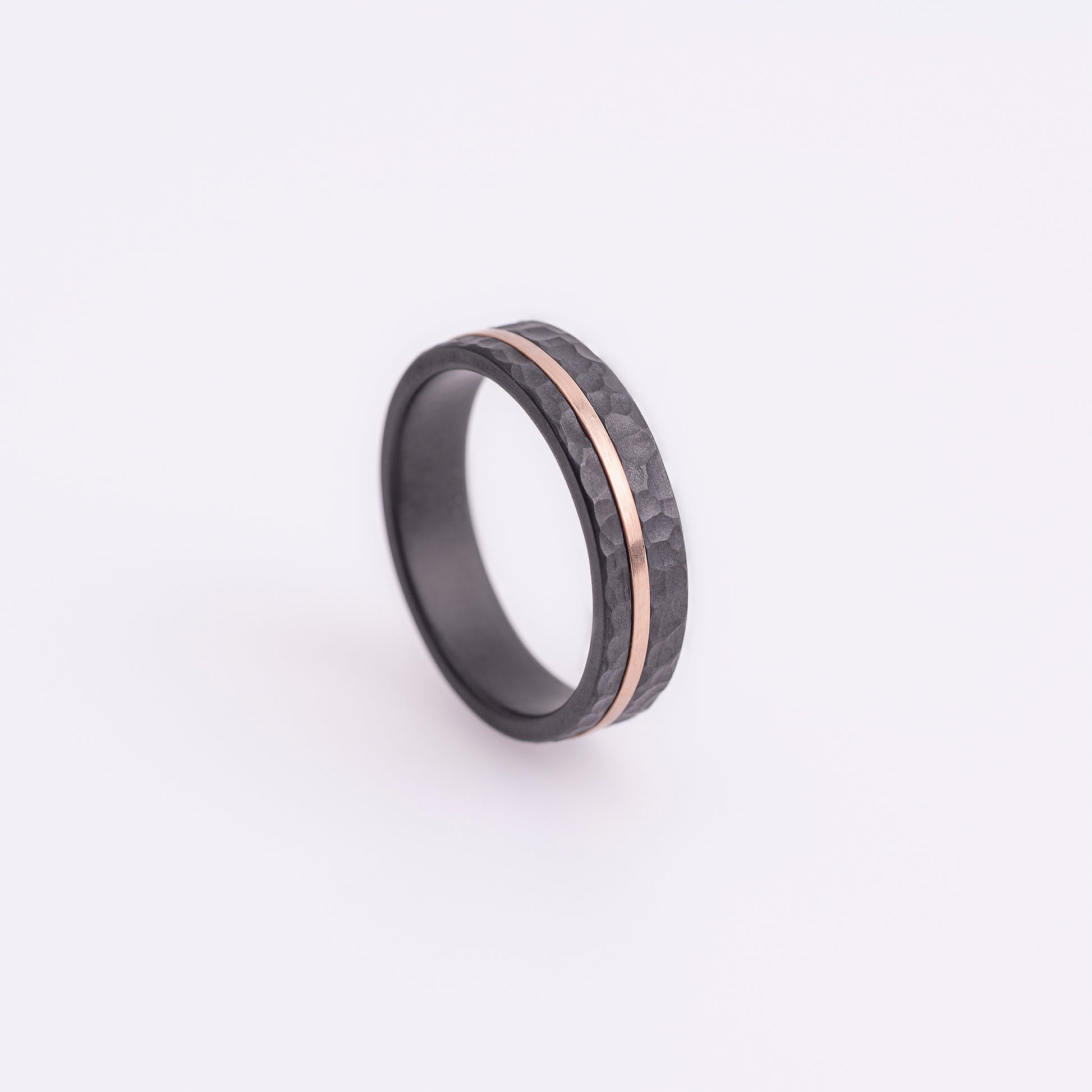 Introducing the Dwayne Ring, a bold and distinctive design crafted from black PVD-coated stainless steel. Featuring a textured base that adds a dynamic, modern touch, this ring is accentuated with elegant 14k rose gold details, including a subtle 1mm rose gold accent that enhances its overall appeal. With a band width of 5 mm, this ring combines industrial strength with refined sophistication. Currently available in size 60.5, the Dwayne Ring can also be ordered in different sizes to ensure the perfect fit. Embrace a unique fusion of contemporary style and luxurious detail with the Dwayne Ring.