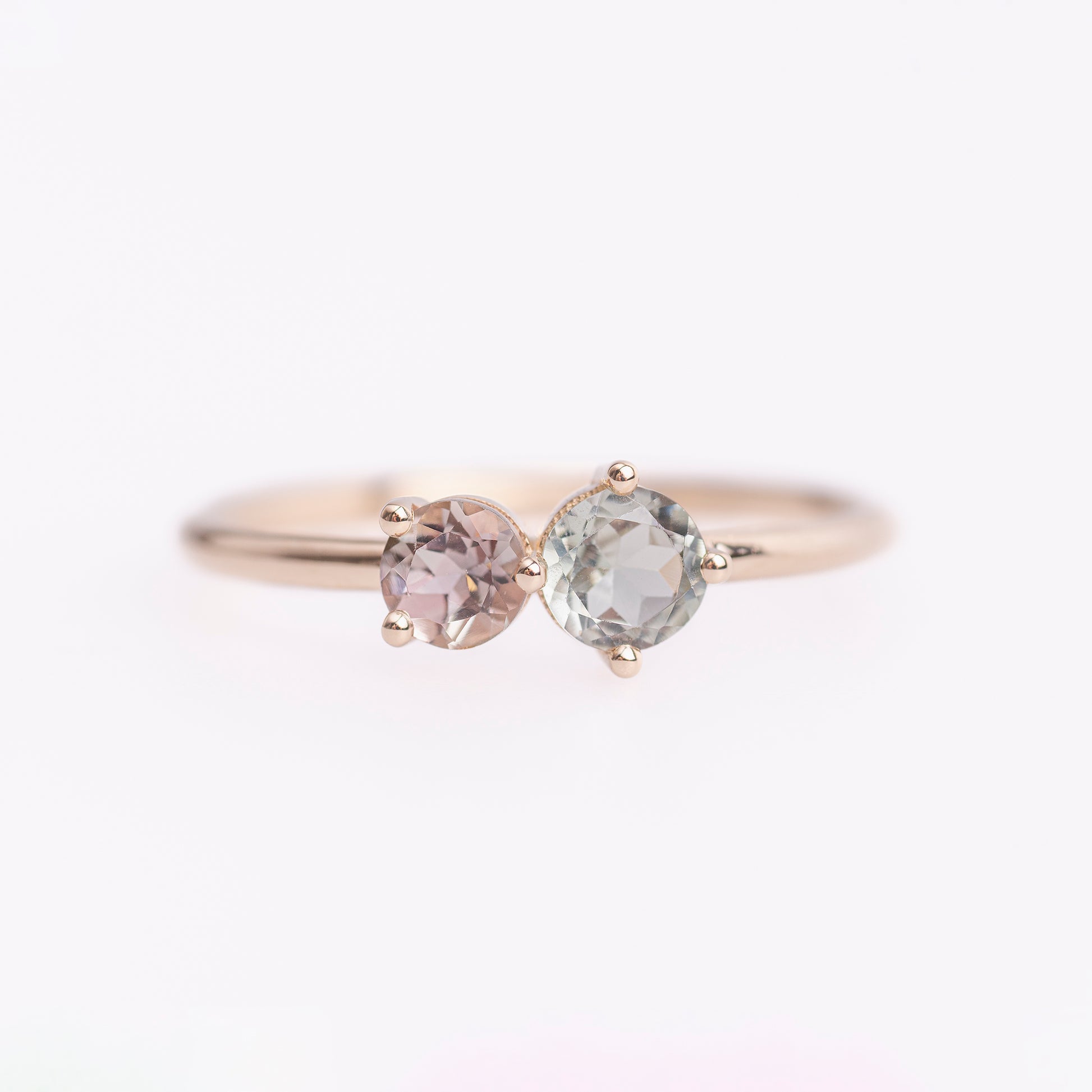 Introducing the Emily Ring, a breathtaking 14k yellow gold Toi et Moi design, symbolizing the union of two souls. This elegant ring features two stunning sapphires: a light green and a soft pink, each chosen for their unique beauty and harmonious contrast. The band provides the perfect backdrop, enhancing the delicate colors of the stones while adding a touch of warmth and luxury.