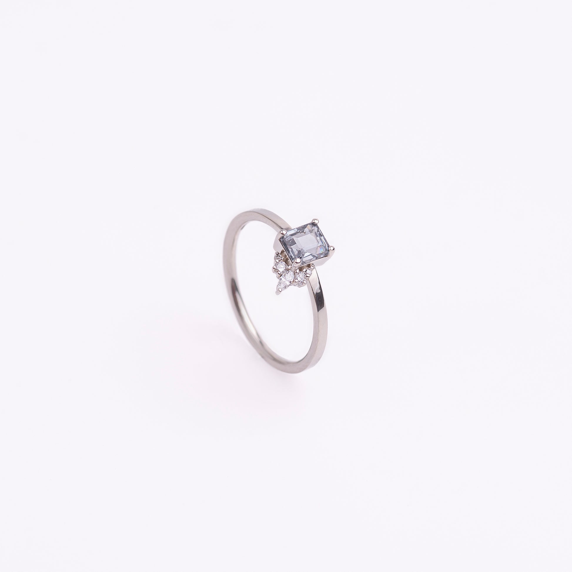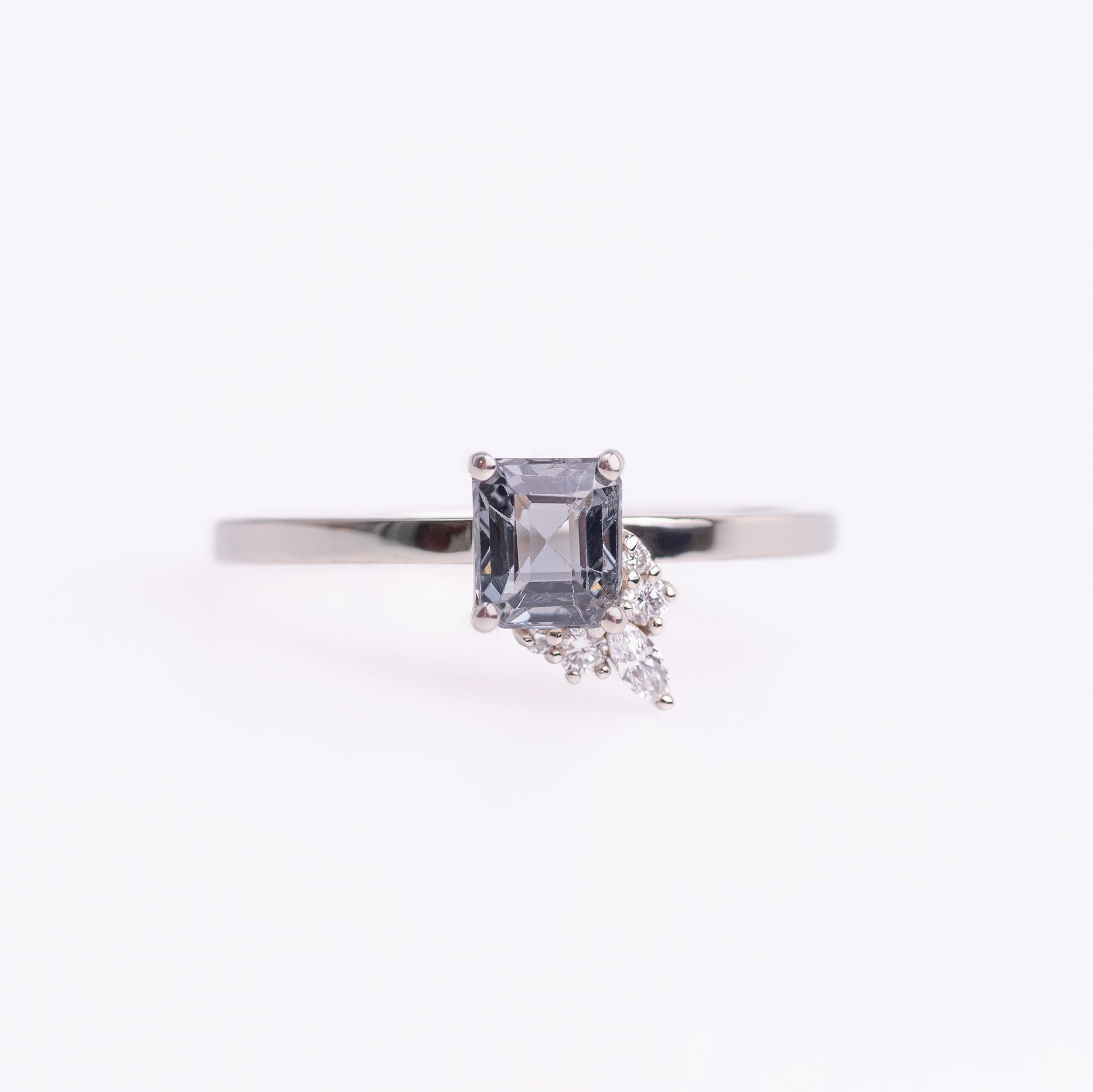 Introducing the Faye Ring, an exquisite piece crafted from 14k white gold. This elegant ring features a striking spinel center stone, surrounded by four small diamonds that enhance its brilliance. The design is further elevated by a navette-shaped diamond, adding a unique and sophisticated touch. The combination of the rich spinel and sparkling diamonds creates a timeless and refined look. Currently available in size 53, this ring can be customized to fit your individual style. Size adjustments are included in the price. Discover the perfect balance of elegance and luxury with the Faye Ring, a truly captivating design.