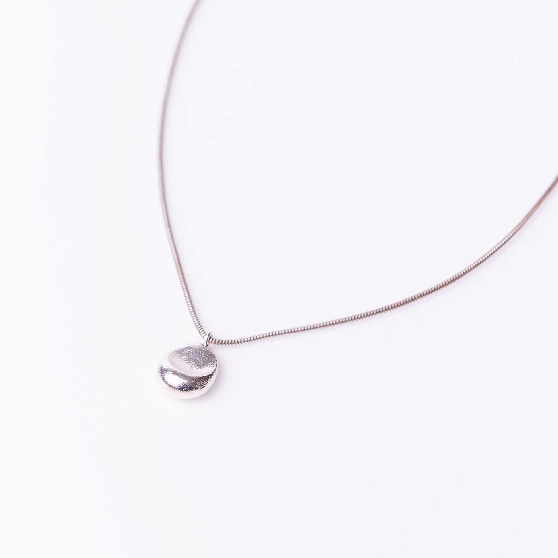 Delicate silver pendant is strung on a slender "snake" chain. Its shape evokes the motion of scooping a small amount of face cream from a jar with the tip of your finger. Designed by Zsófia Gizella Biró, this piece is part of her 2020 quarantine collection, inspired by bathroom cosmetics. A perfume, face cream, or any beauty product is a special elixir to which its user is as attached as they are to a piece of jewelry.