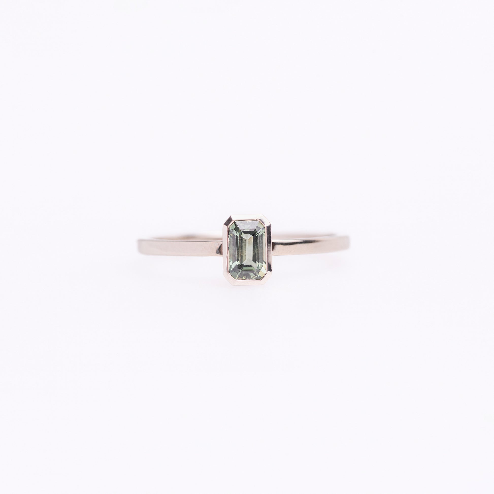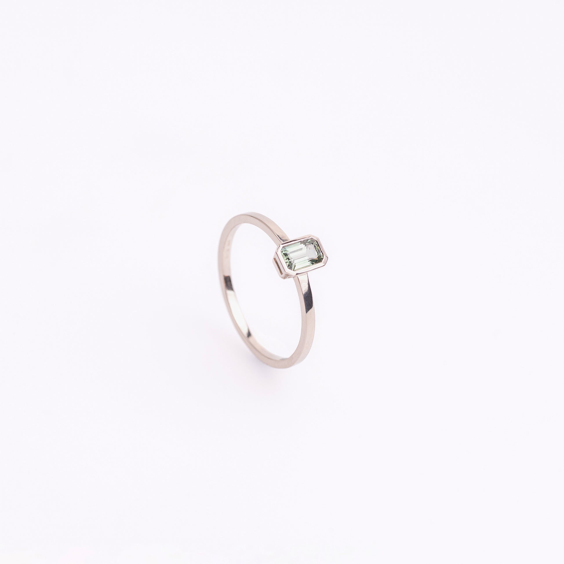 At the heart of the design rests a baguette-cut green sapphire, celebrated for its clean lines and distinctive architectural shape. The gemstone’s rich green hue brings depth and character, creating a harmonious balance between bold color and understated elegance. Each sapphire is thoughtfully selected to ensure clarity, vibrance, and a unique presence.