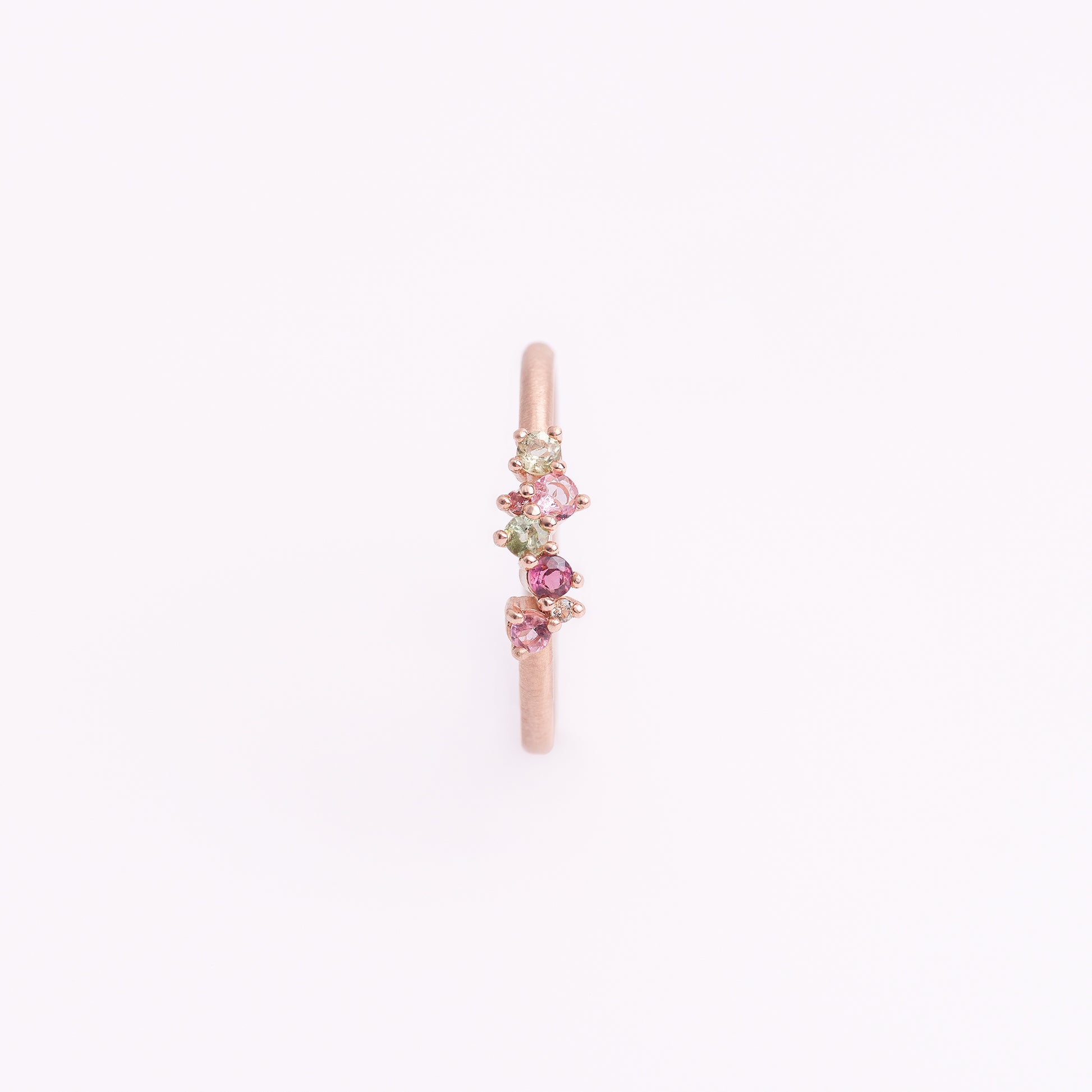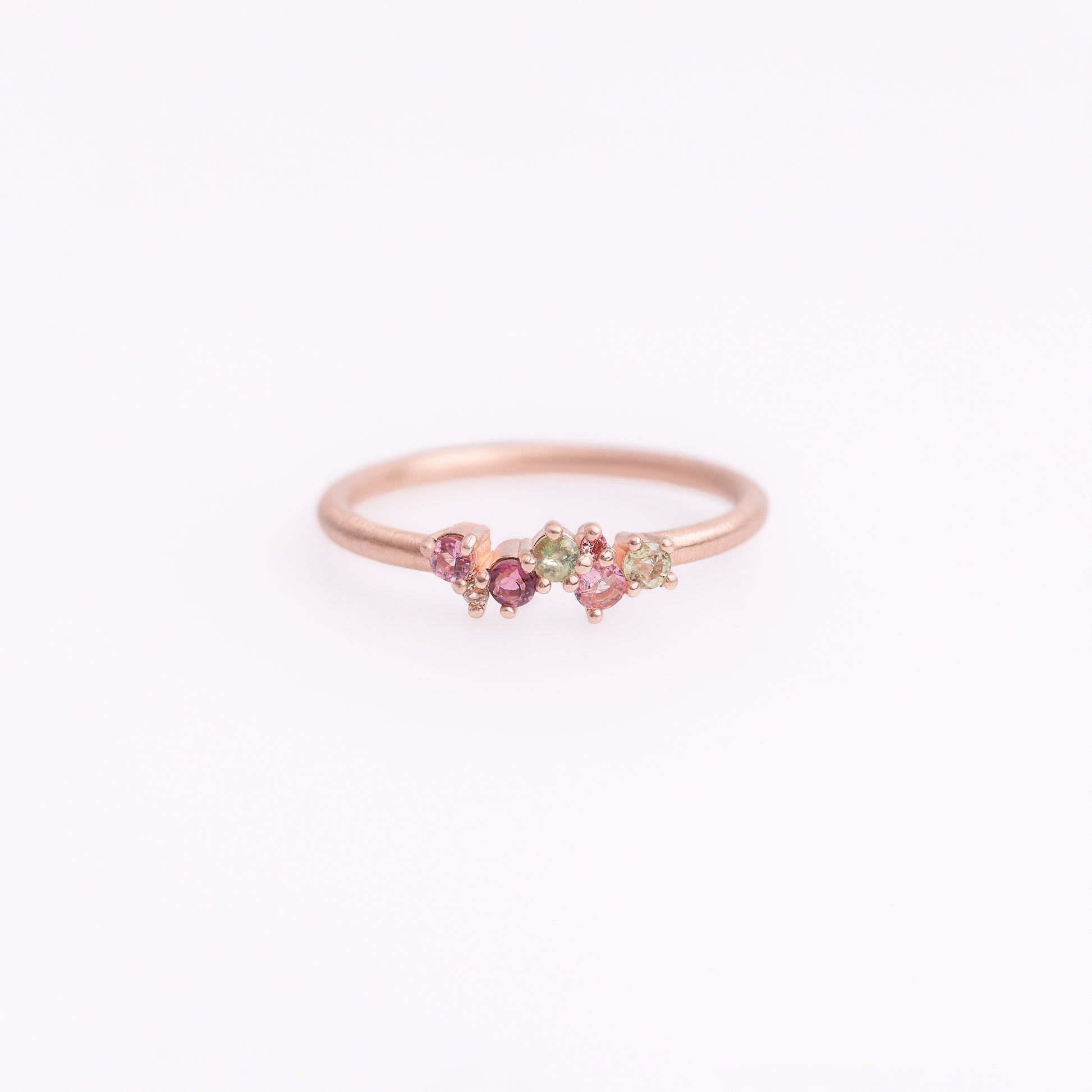 The ring is adorned with seven dazzling sapphires in vibrant shades of green and pink, creating a beautiful contrast that adds a playful yet refined touch. Each gemstone is carefully selected, ensuring a unique and eye-catching design.