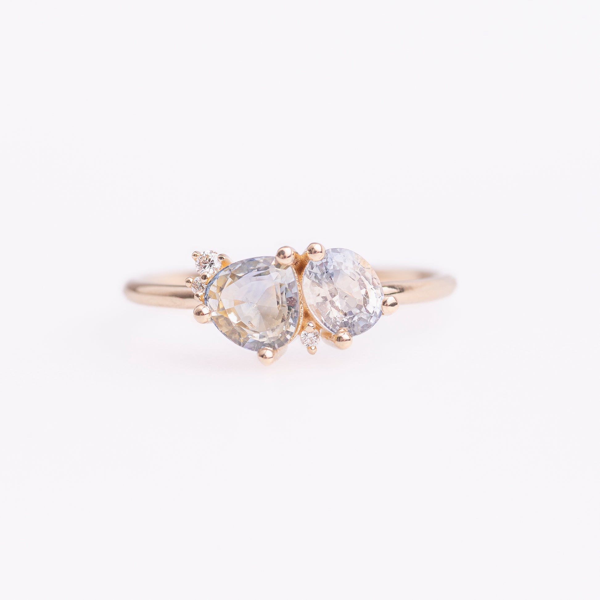 Introducing the Hazel Ring, a stunning toi et moi design that blends timeless elegance with vibrant color. Crafted in luxurious yellow gold, this exquisite ring features two sapphires—a vivid green sapphire and a serene blue sapphire—gracefully intertwined to symbolize connection and balance. Adding a touch of sparkle, three delicate white diamonds are set along the band, enhancing the ring’s refined beauty.