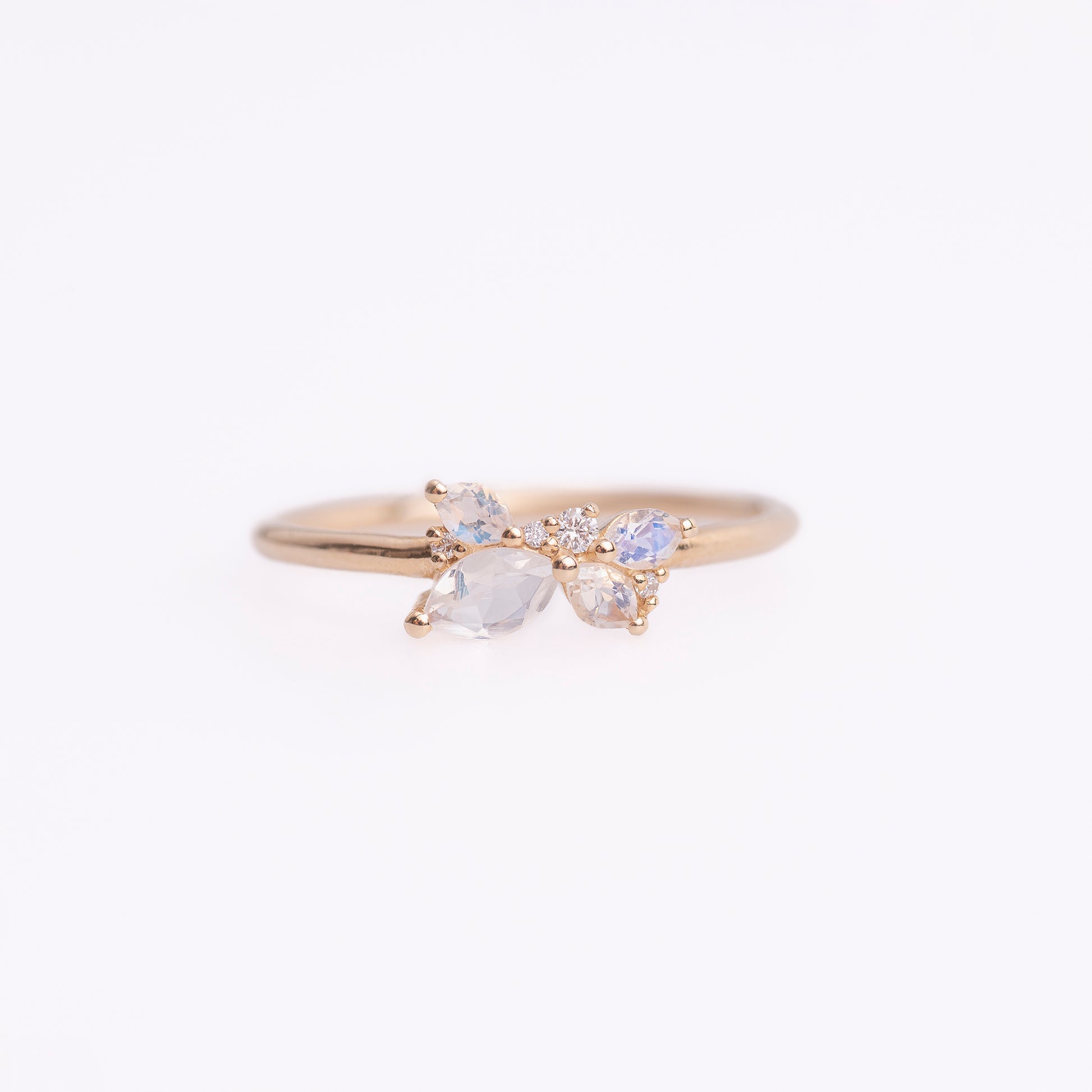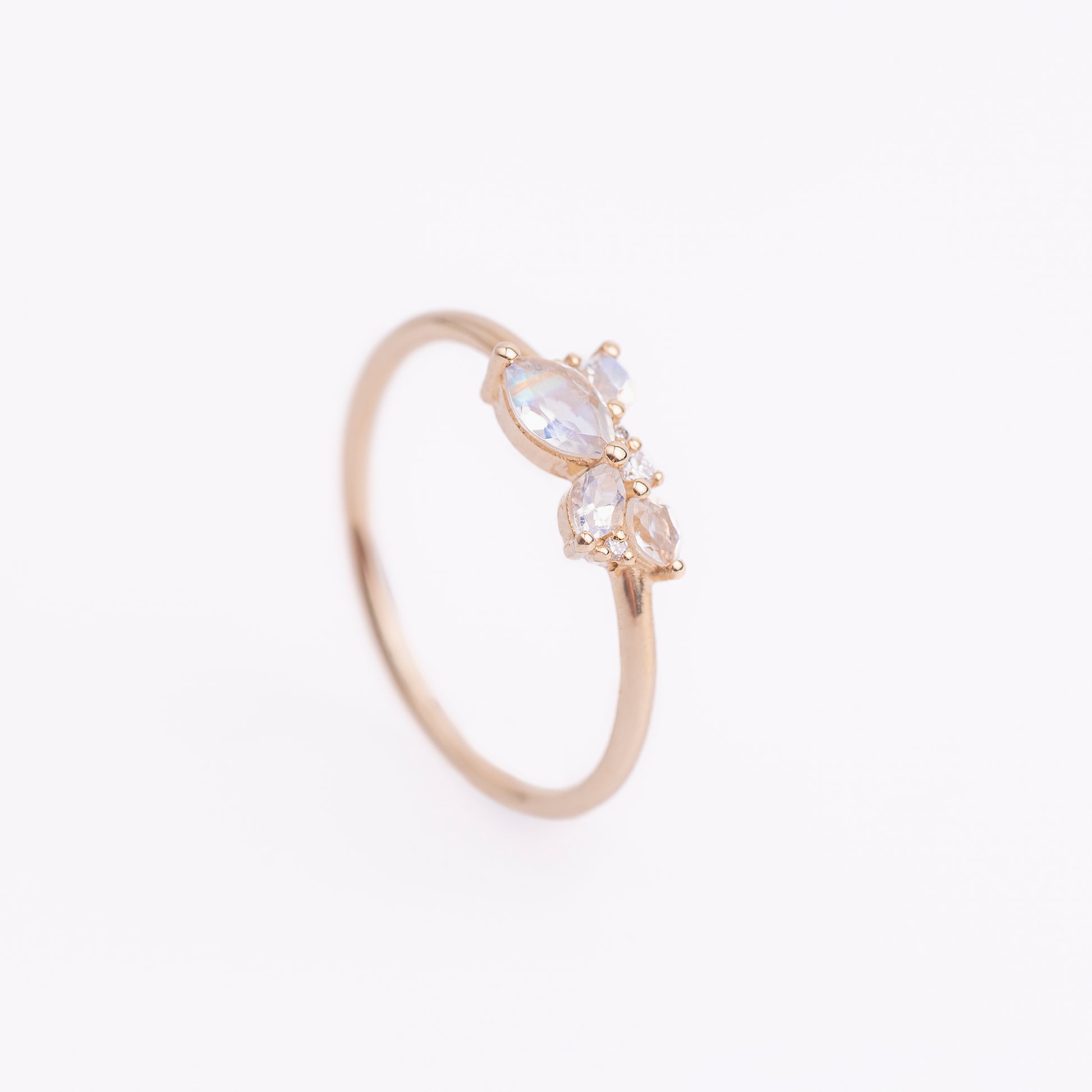 The Helena ring is a sophisticated blend of elegance and artistry, crafted in yellow gold and featuring four navette-cut moonstones accented by four small brilliant diamonds. The combination of luminous moonstones and sparkling diamonds creates a harmonious, eye-catching design that is both delicate and striking.