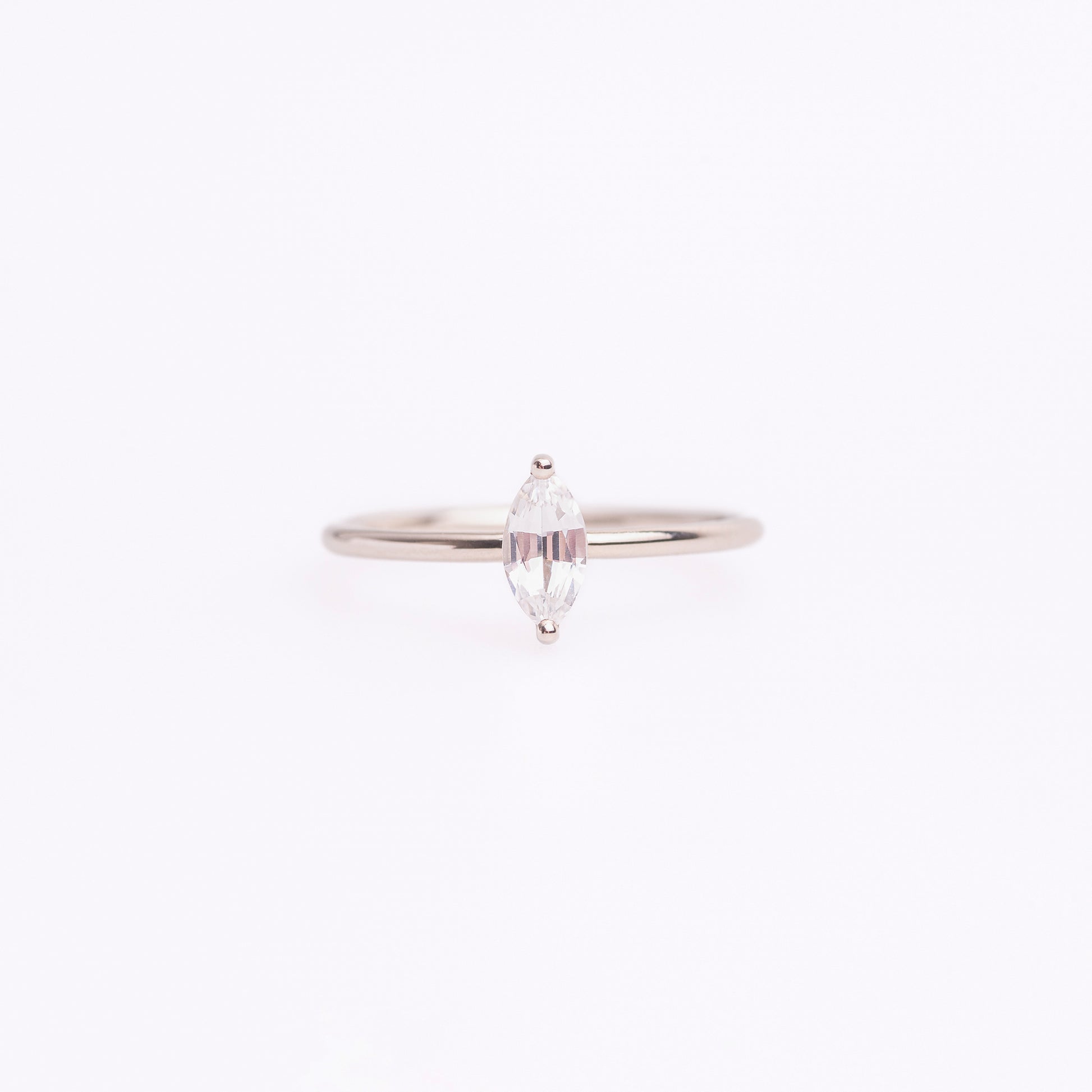 The centerpiece is a beautifully faceted marquise-cut white sapphire, radiating a soft, crystalline brilliance. Its elongated shape adds a touch of graceful drama, making the ring both understated and captivating. Each gemstone is carefully selected to ensure exceptional clarity and a refined, sparkling finish.