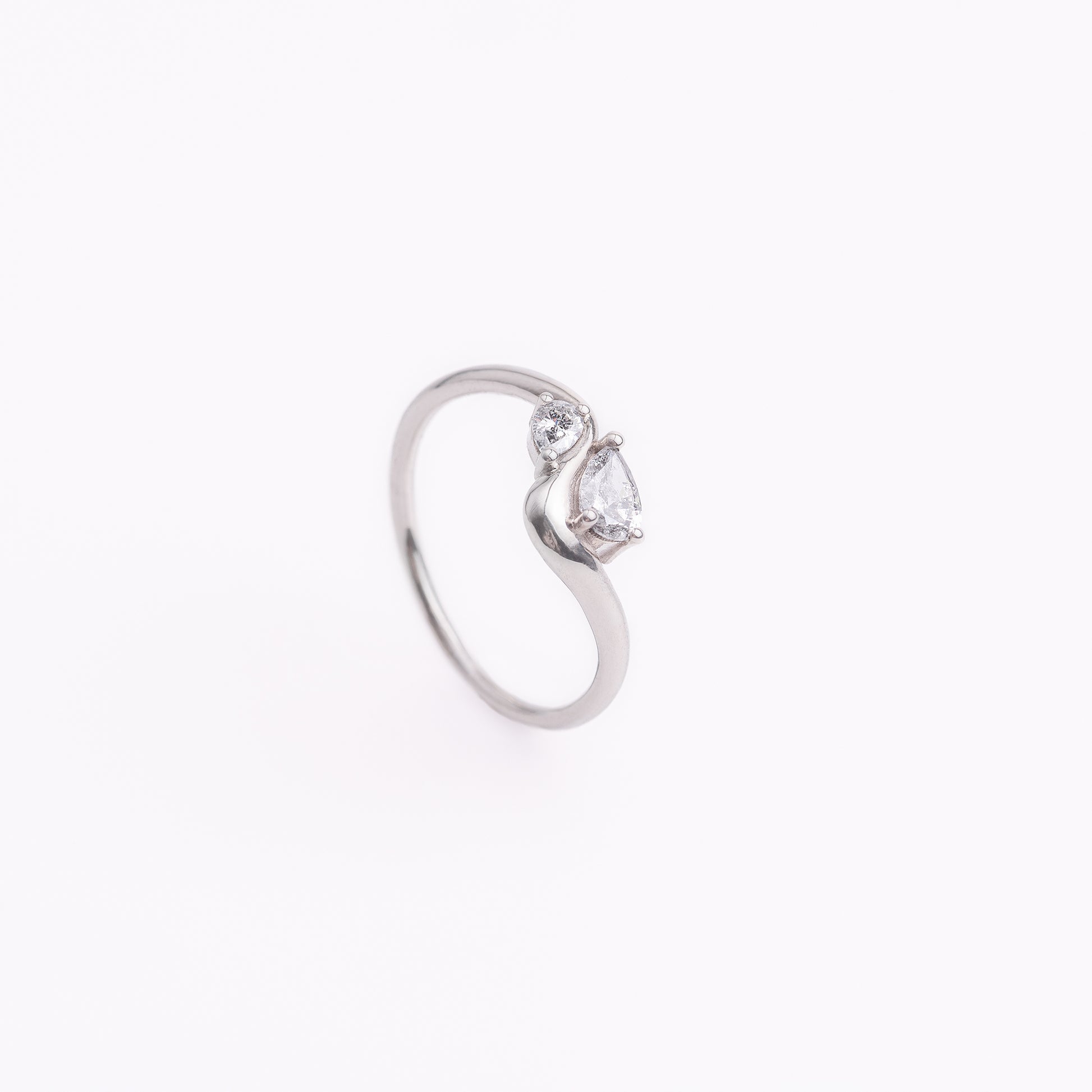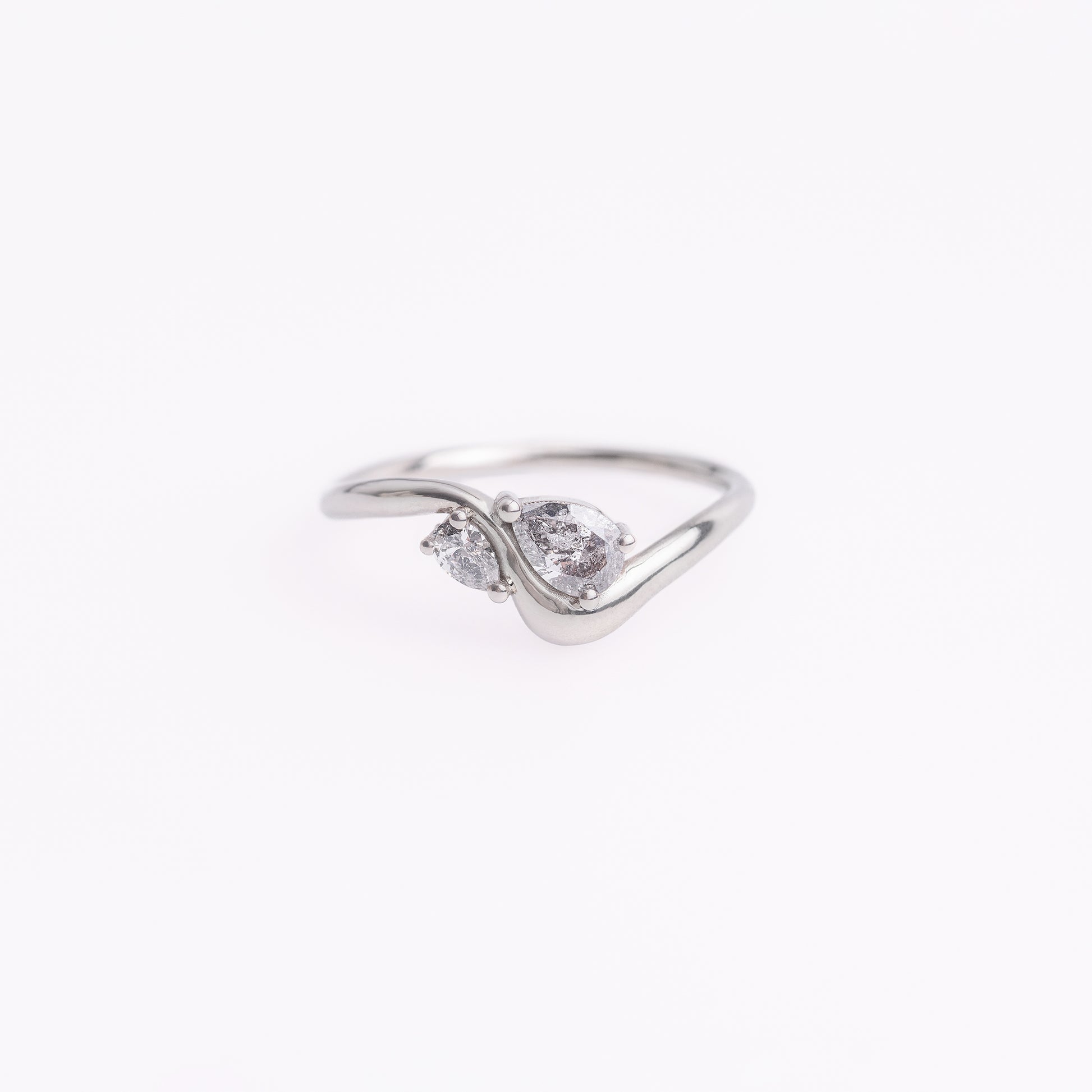 The Josephine Ring is made from 14k white gold, showcasing a stunning shiny finish that enhances its elegance. Adorning the band are two drop-cut salt and pepper diamonds, each one distinct in its character and charm, ensuring that no two rings are alike.