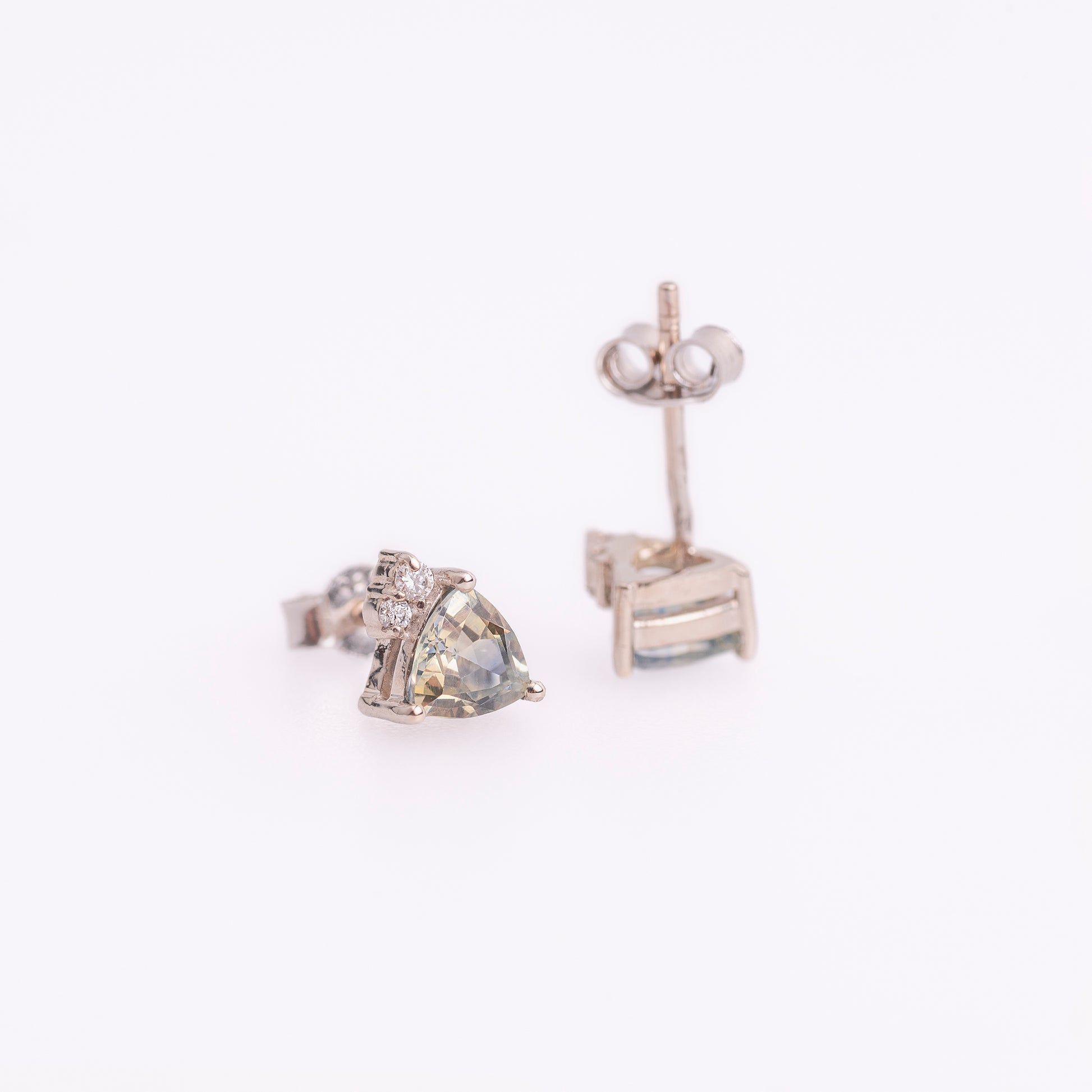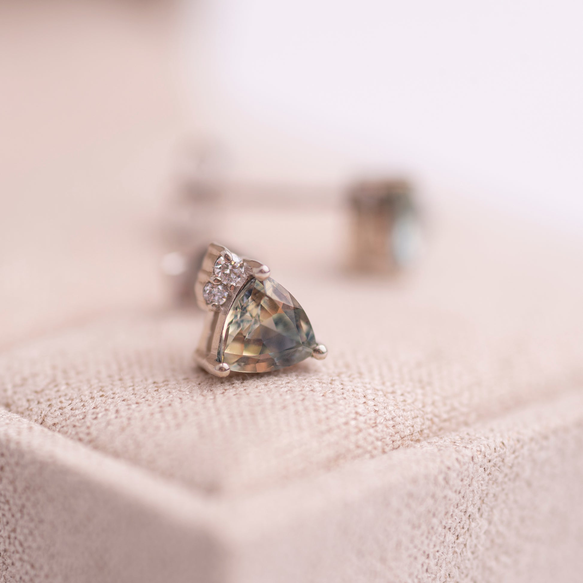 Elegant and distinctive, the Avia earrings are crafted in white gold and feature a stunning bicolor greenish-blue trillion-cut sapphire, complemented by two sparkling round diamonds on each earring. The combination of unique color and precise cuts creates a harmonious balance of brilliance and sophistication.