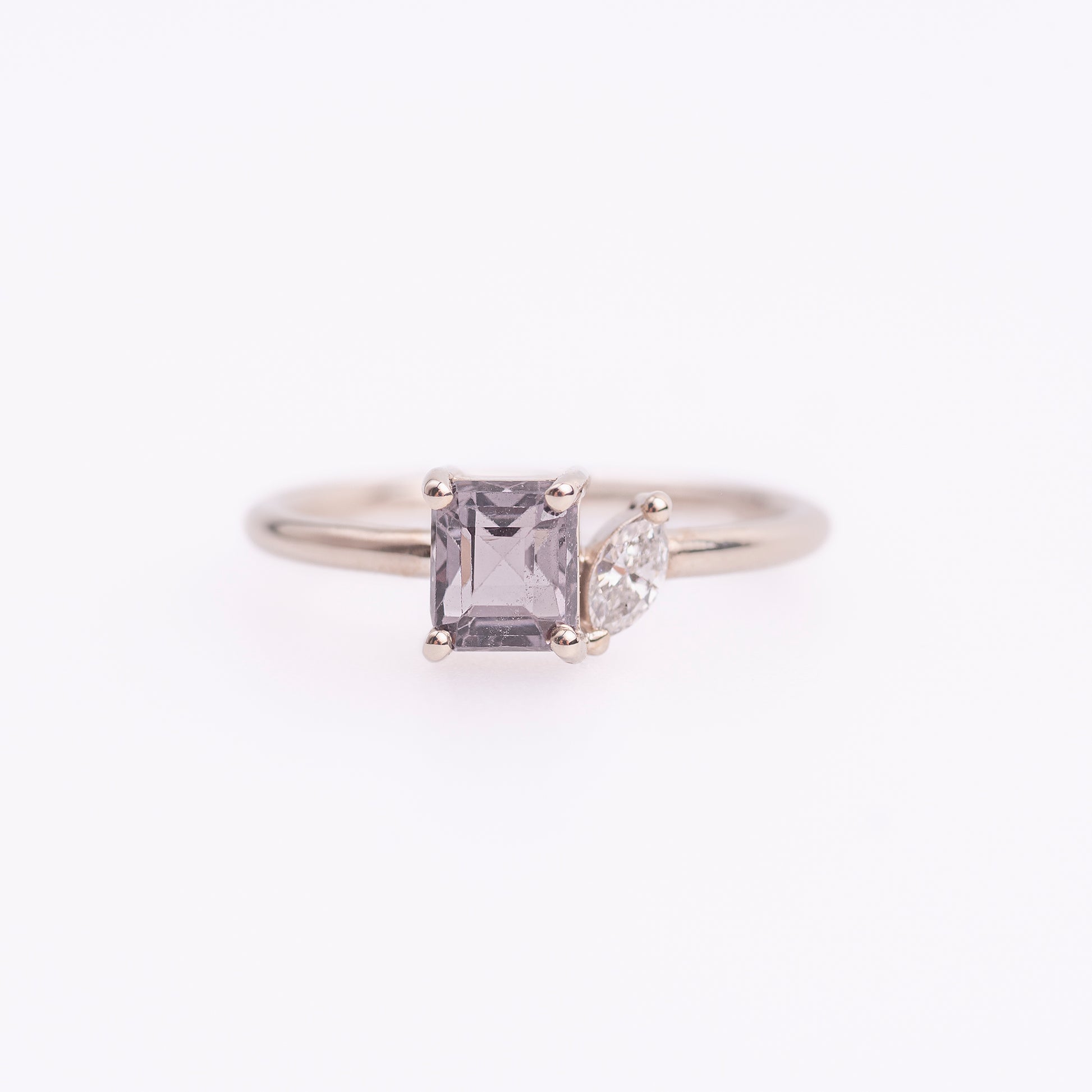 The Maya ring is a striking blend of modern elegance and timeless design, crafted in white gold and set with two distinctive gemstones. At its center lies a greyish-purple emerald-cut spinel, its subtle depth beautifully contrasted by a navette-cut salt and pepper diamond. Together, they create a captivating harmony of color and form—sophisticated yet bold.