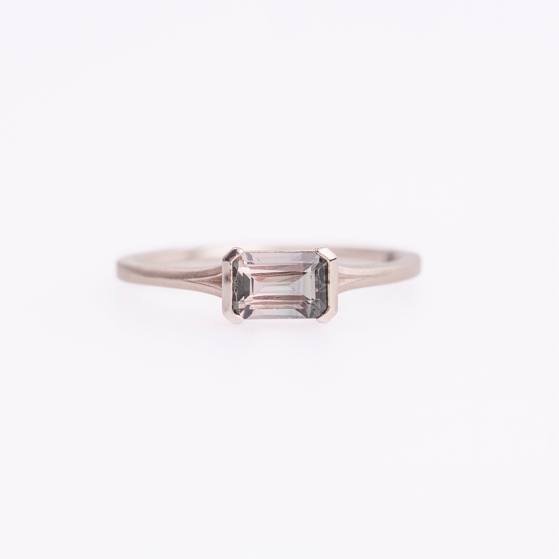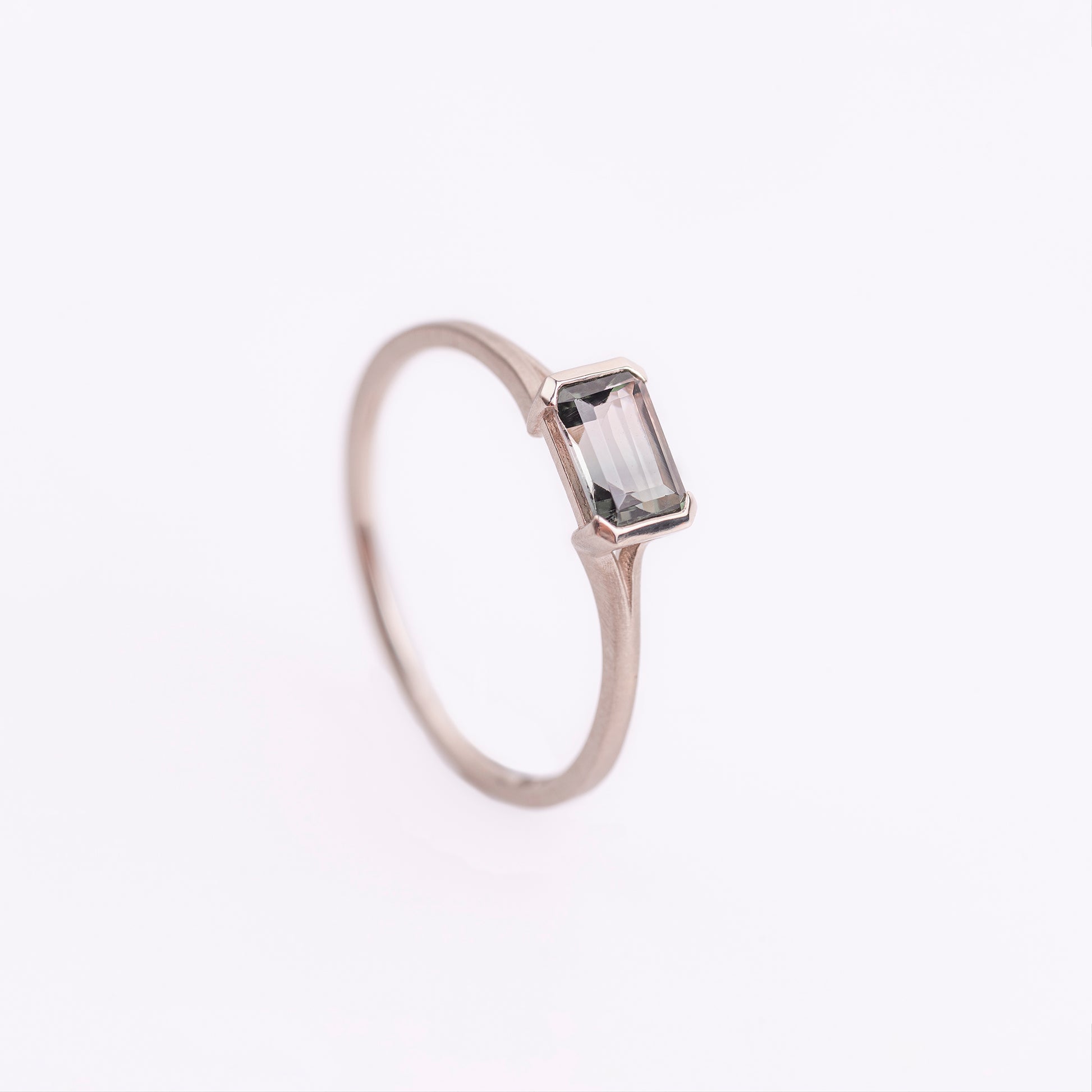 Sleek and refined, the Mira ring is crafted in white gold and set with a striking baguette-cut tourmaline. The clean lines of the gemstone highlight its natural brilliance, creating a design that feels effortlessly modern while retaining timeless elegance.