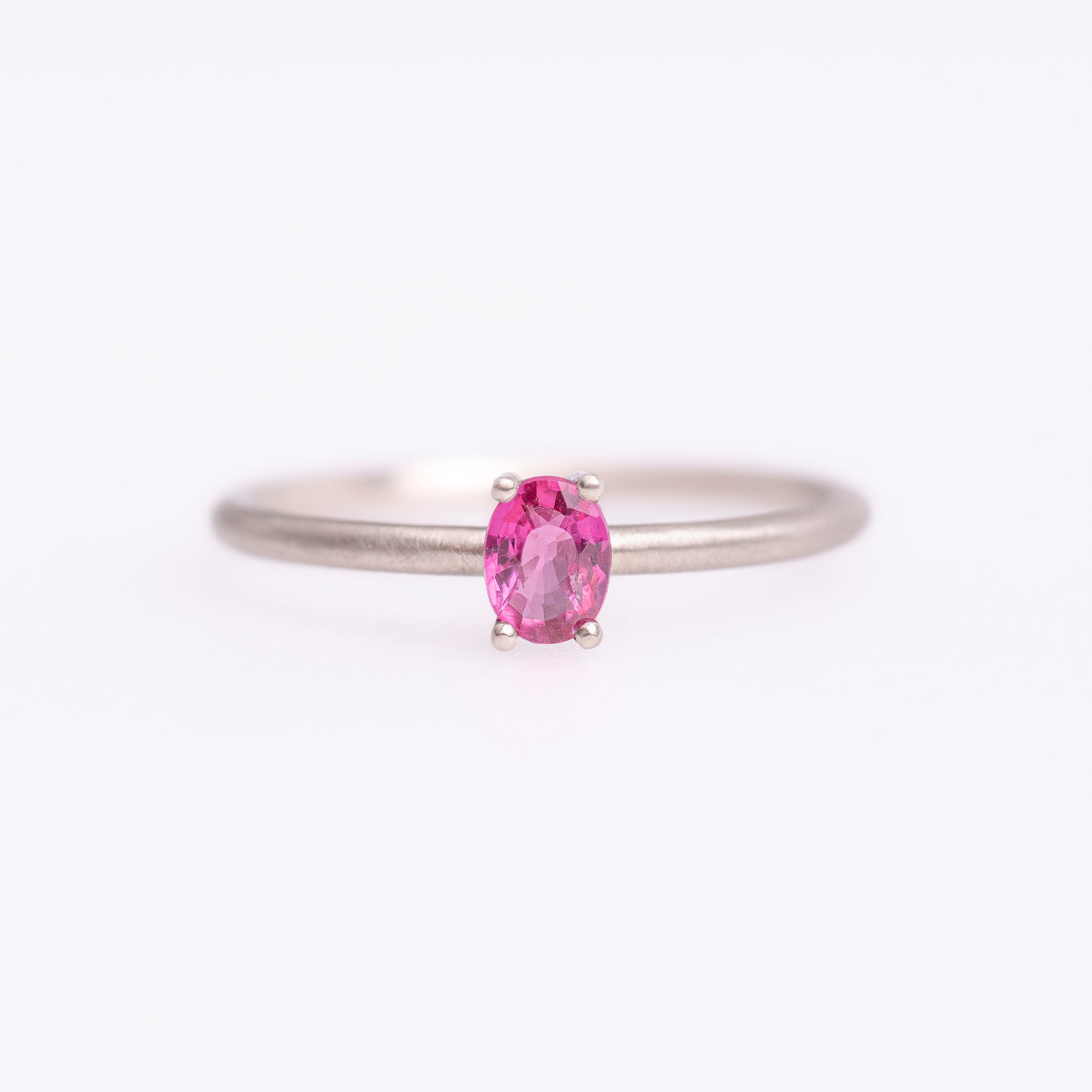 Introducing the Rosie Ring, a refined piece crafted from 14k white gold with a sophisticated matte finish. At the heart of this elegant design lies an oval ruby, measuring 4.8 x 3.5 mm, delicately held in place by four small prongs. The soft texture of the matte band beautifully contrasts with the rich, vivid hue of the ruby, creating a timeless and understated look. Currently available in size 52, this ring can be customized to suit your unique style. Size adjustments are included in the price. Experience the quiet elegance of the Rosie Ring, where simplicity and luxury come together in perfect harmony.