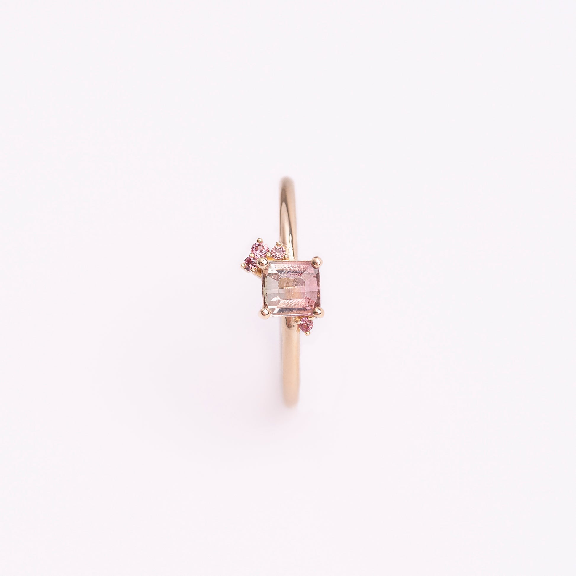 Introducing the Saanvi Ring, a breathtaking piece crafted from 14k yellow gold. At its center, a stunning princess-cut watermelon tourmaline displays a beautiful blend of pink and green hues, creating a unique and vibrant focal point. Surrounding the tourmaline are five small sapphires, adding a touch of sparkle and color that perfectly complement the rich tones of the tourmaline. The elegant design is a perfect balance of modern sophistication and timeless beauty. Currently available in size 53.5, this ring can be customized for the perfect fit. Size adjustments are included in the price. Embrace the exceptional charm of the Saanvi Ring, a true statement of elegance and individuality.