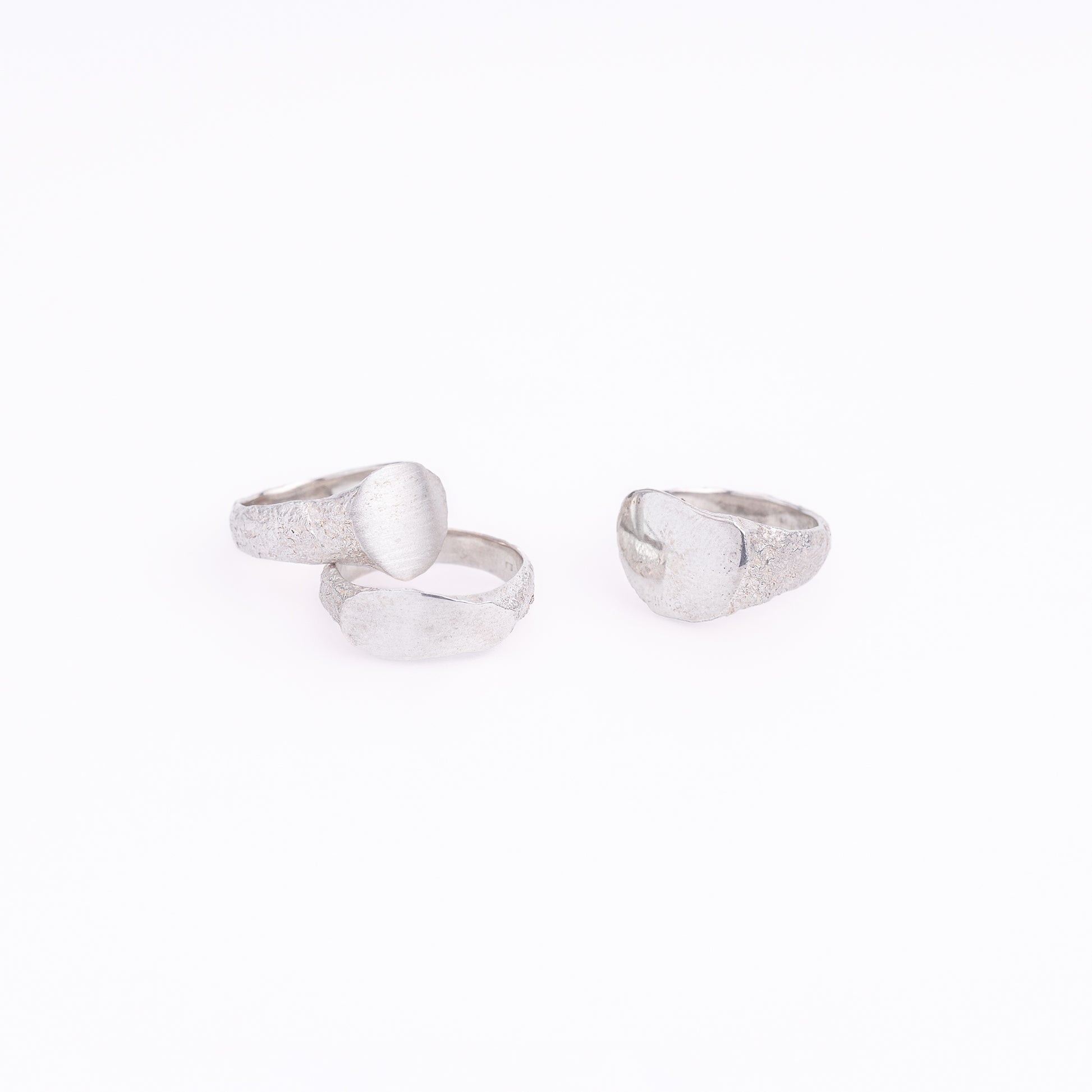 The Seashell Signet Rings feature a detailed surface that captures the texture of seashells found along the shore. These intricate, nature-inspired pieces bring the beauty of the beach to life with their exquisite design.