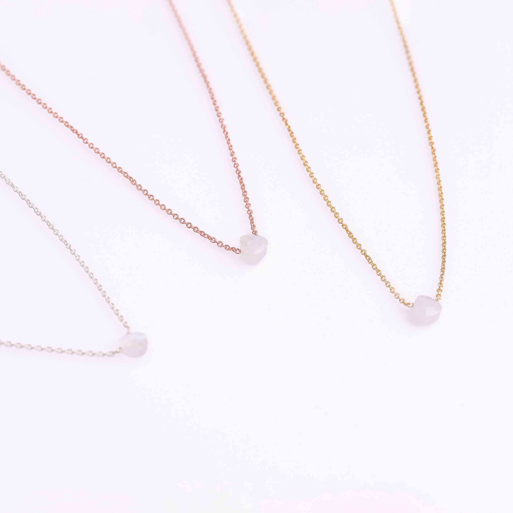 Introducing the Soir Necklace – a delicate and timeless piece available in silver, gold-plated silver, or 14k gold, featuring a gracefully drop-cut moonstone. Known for its ethereal glow and enchanting play of light, each moonstone carries a unique, mystical charm.