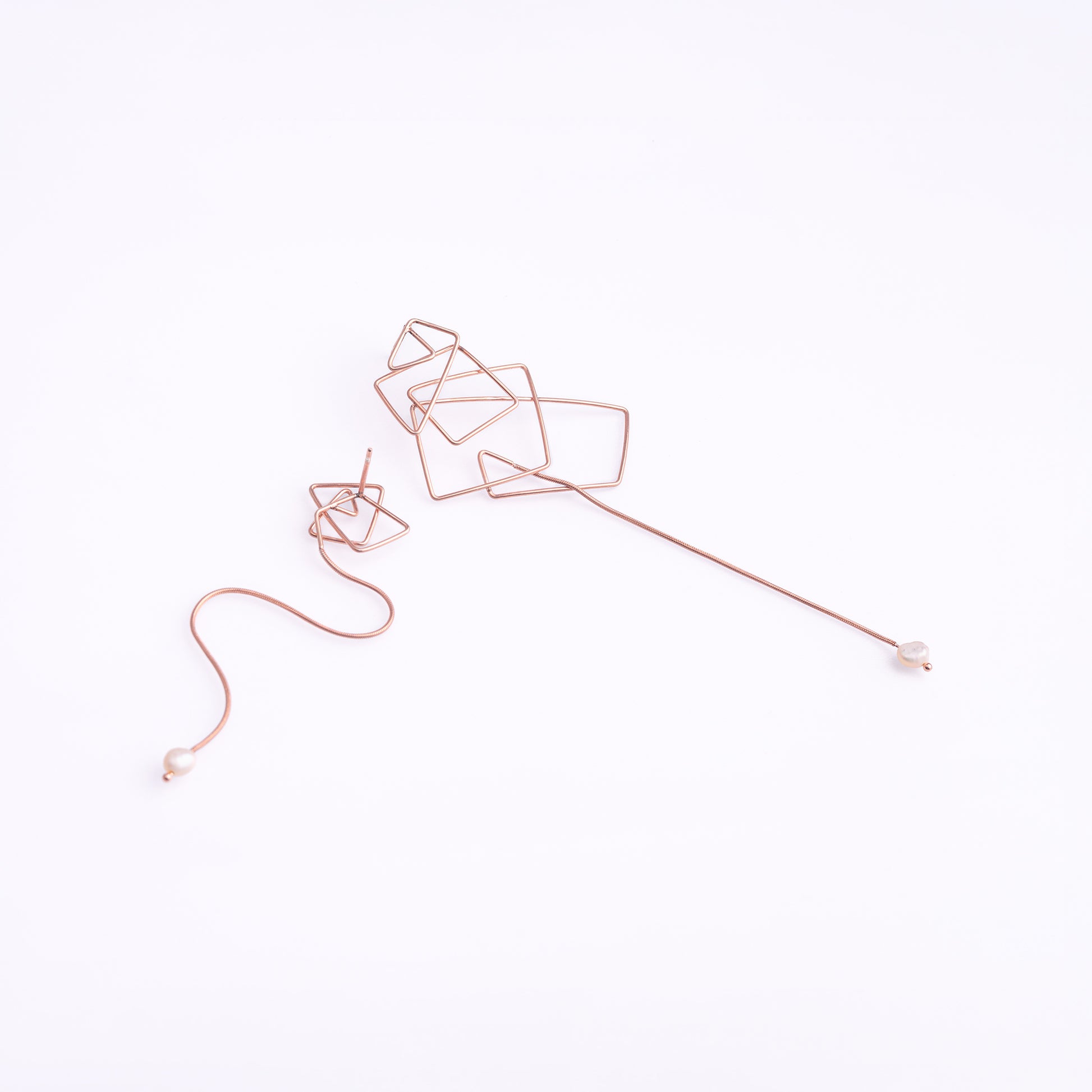 With the bridal line, we present a new way of adorning oneself. The bridal rose dream earrings feature an asymmetrical design with exquisite snake chains and delicate peach pearls.