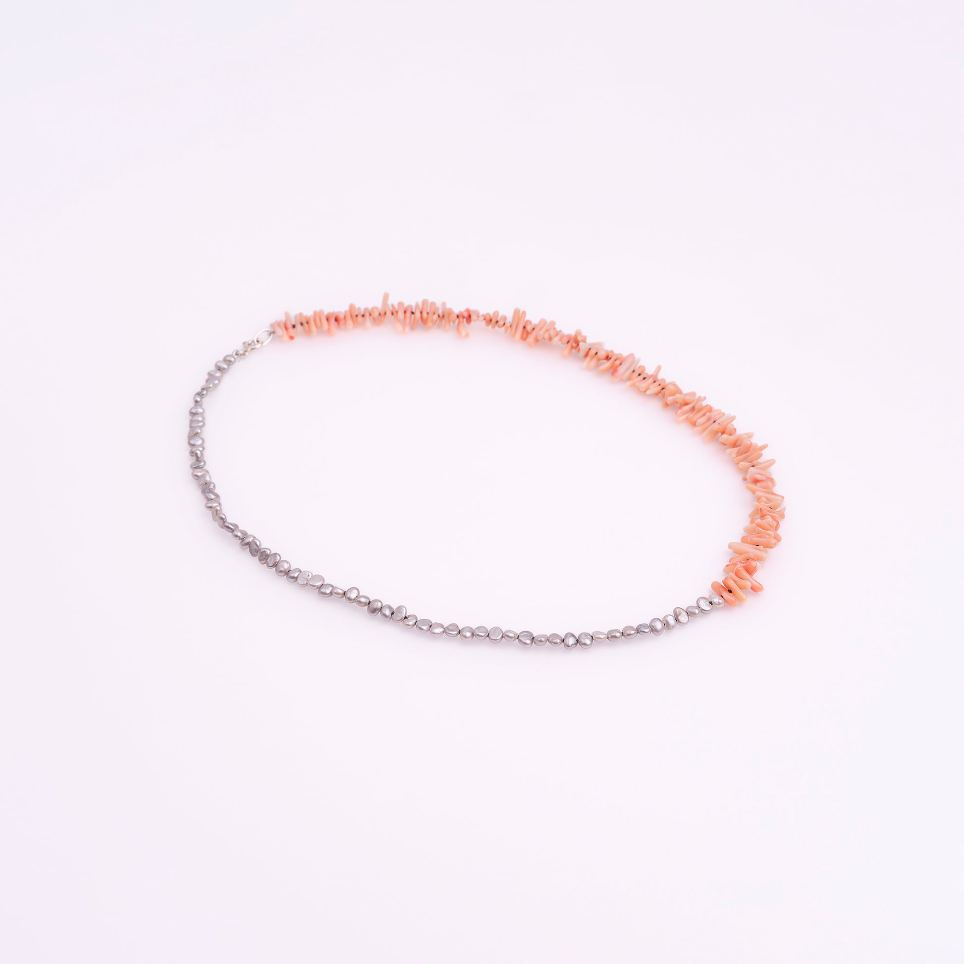 A striking piece from the Vague Collection, this necklace blends natural elegance with a modern edge. Featuring an asymmetrical design, it combines the warmth of coral beads with the timeless luster of genuine freshwater pearls.