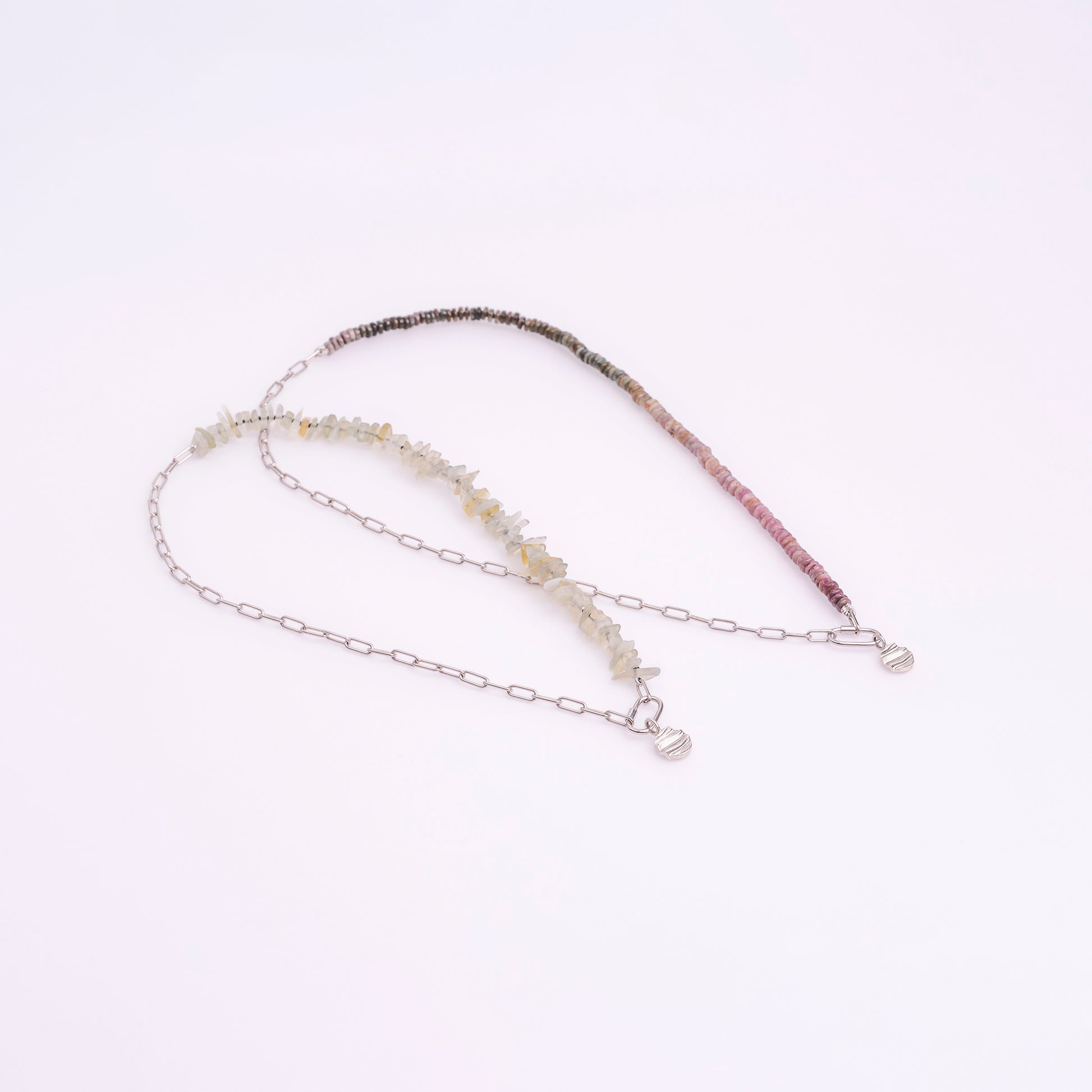 Hand-knotted gemstone necklace with 5 mm tourmaline beads, finished with a sterling silver chain, pendant, and clasp. The black thread highlights the natural color variations of the stones, giving the piece a refined yet contemporary character.